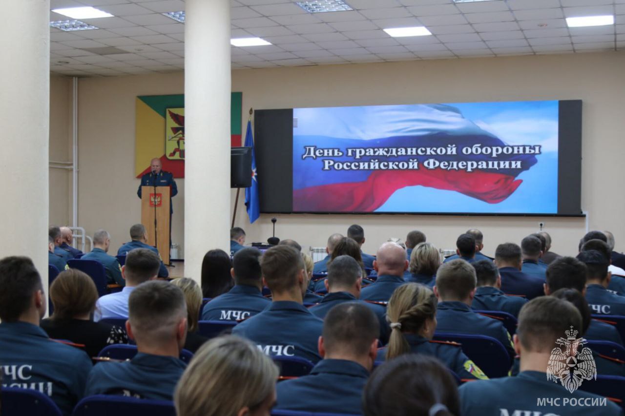 В актовом зале Главного управления МЧС России по Забайкальскому краю состоялось торжественное собрание, посвященное 93-й годовщине со дня образования гражданской обороны России. В праздничном мероприятии приняли участие действующие сотрудники чрезвычайного ведомства, ветераны гражданской обороны, а также представители Забайкальской железной дороги и Департамента гражданской обороны Забайкальского края, медицины катастроф.