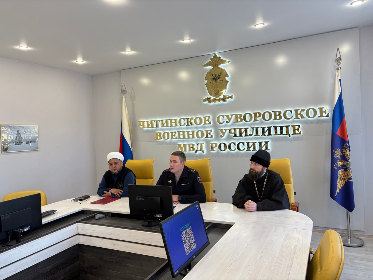 21 октября 2025 года в рамках занятий по морально-психологической подготовке при содействии Общественного совета УМВД России по Забайкальскому краю прошла встреча личного состава Читинского суворовского военного училища МВД России с представителями традиционных конфессий: иереем Валерием Шаферовым - ключарем Казанского собора и заместителем муфтия Забайкальского края Хазратом Абдиваси.Православный священник и муфтий поговорили с сотрудниками о традиционных семейных ценностях и сбережению населения