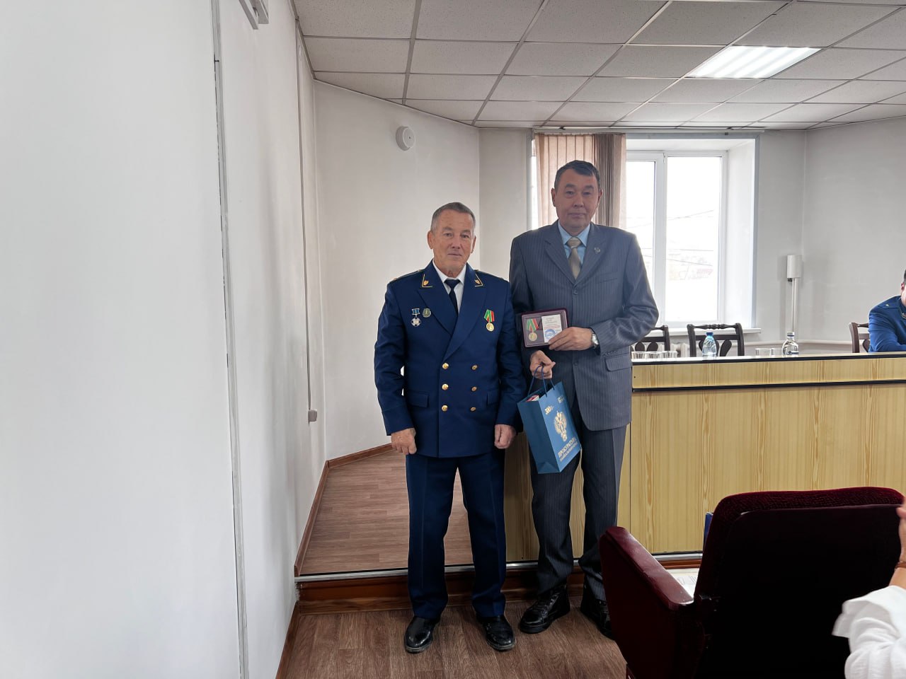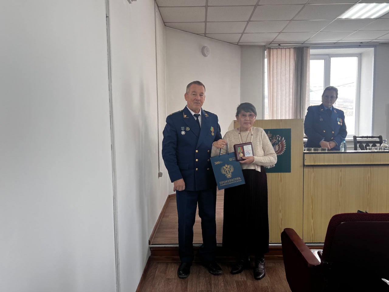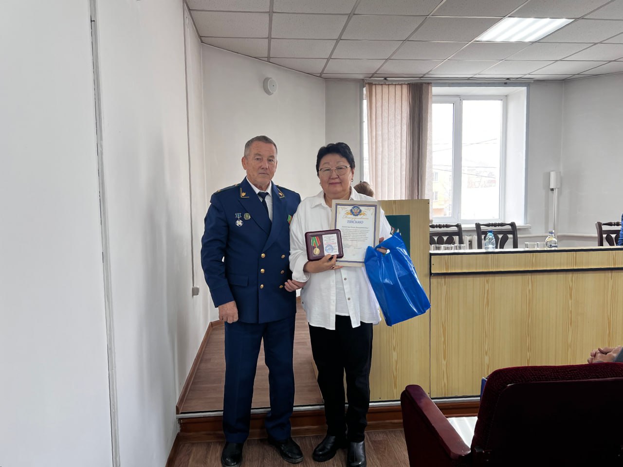 Вчера представители общественной организации ветеранов и пенсионеров прокуратуры Забайкальского края и отдела кадров регионального надзорного ведомства в ходе рабочей поездки в Агинский Бурятский округ в помещении прокуратуры Агинского района вручили юбилейные медали пенсионерам – Дашиниме Аюрову, Елене Батоболотовой, Римме Батомункуевой, Борису Баторову, Алексею Петрову, Бальжиме Цымпиловой и Дамдину Цырендоржиеву.