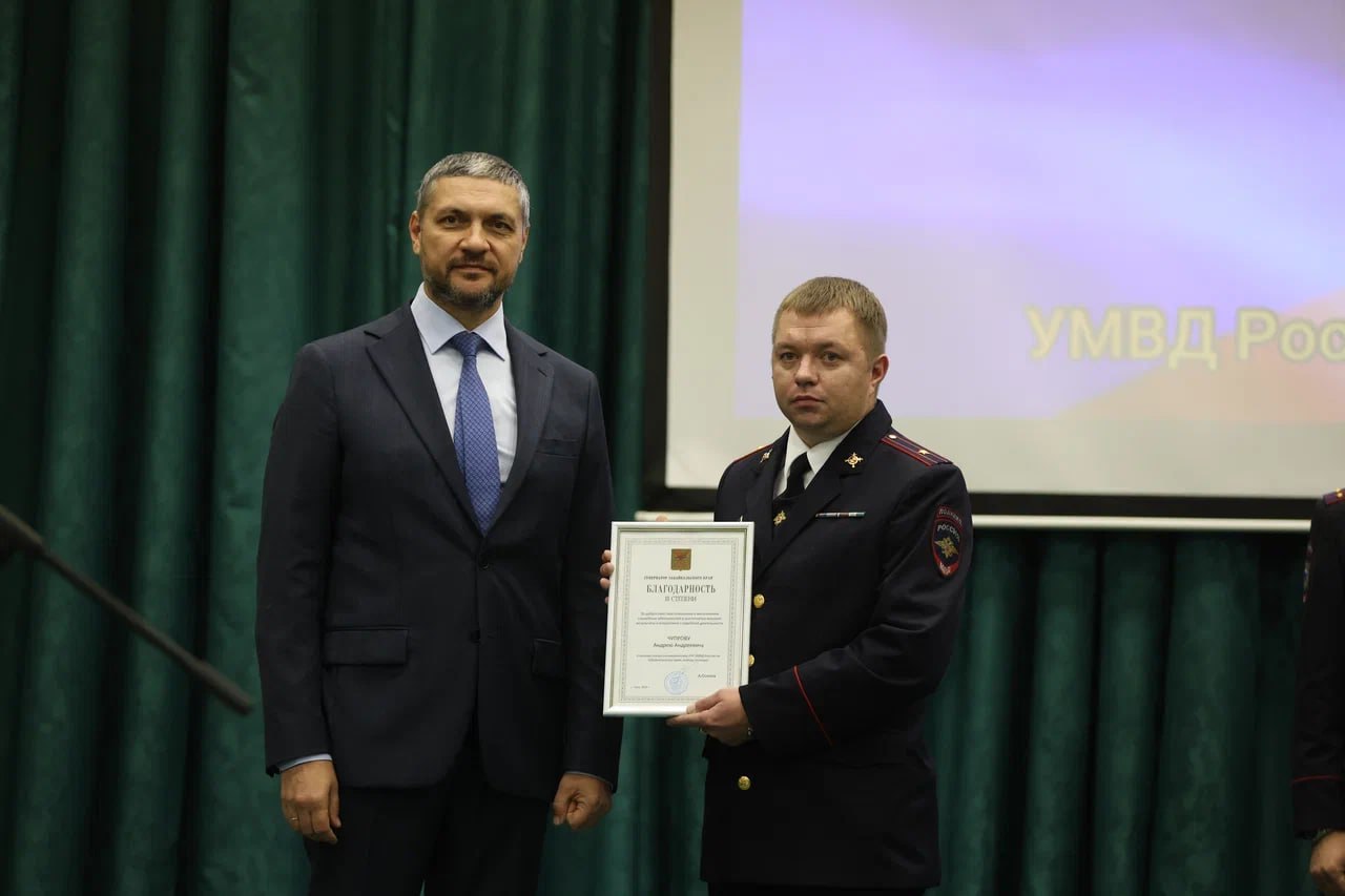 Глава региона вручил благодарственные письма сотрудникам полиции Забайкалья, которые показали высокие результаты оперативно-служебной деятельности. Начальник УМВД России по Забайкальскому краю Вячеслав Еговцев рассказал о значимых событиях правоохранительной деятельности на территории Забайкалья и Читы. Также он вручил благодарственные письма сотрудникам полиции, в том числе тем, кто отличился при тушении лесных пожаров в Читинском округе в мае–июне 2025 года.