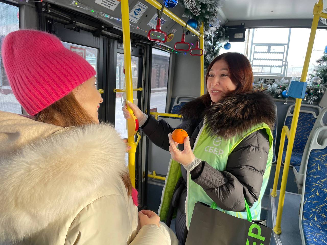 Звучащая внутри волшебная мелодия создает атмосферу сказки, а волонтеры вручают пассажирам ароматные мандарины.