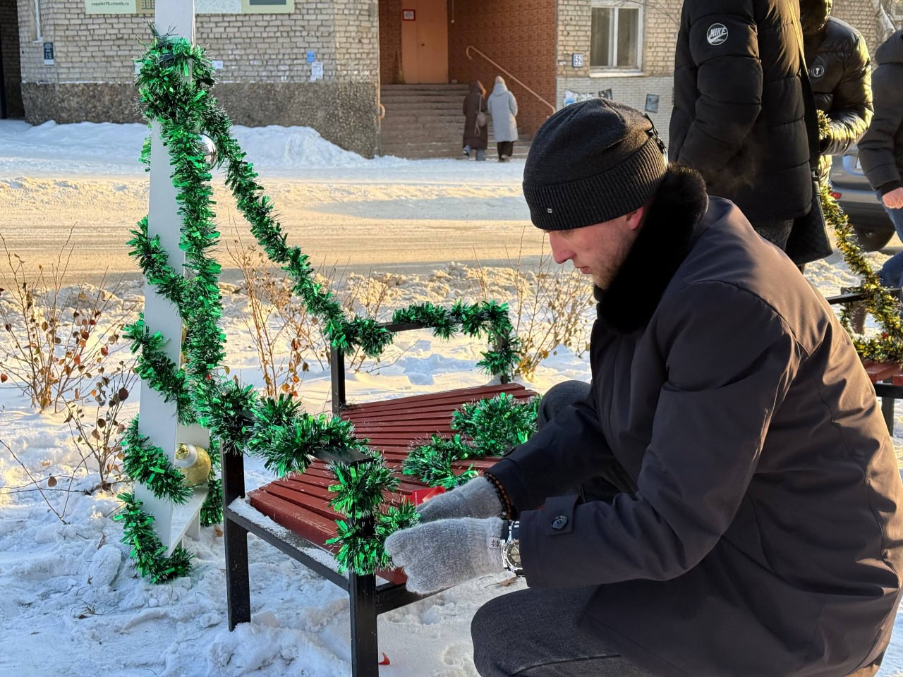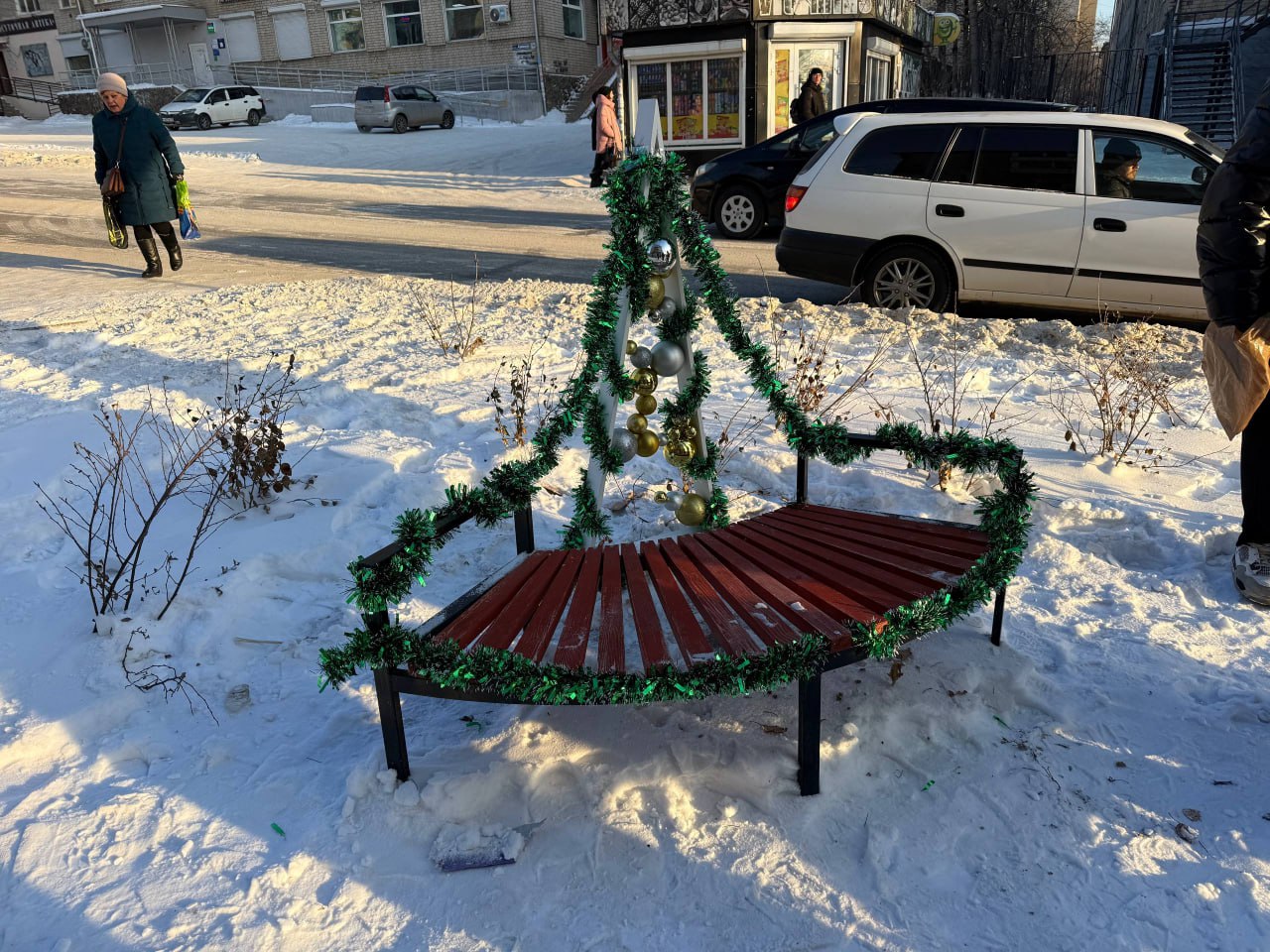 Участник регионального кадрового проекта «Герои — Победы. Будущее» Егор Бобылёв вместе с командой студентов-волонтёров из разных учебных заведений Забайкалья превратили клумбу в настоящий новогодний уголок. В центре композиции — инсталляция из ёлок, украшенная золотыми и серебряными шарами, а в дополнение к ним — скамейки, обвитые мишурой. Как уточнил Егор Бобылёв, это не просто декор: это место, где можно остановиться, отдохнуть и окунуться в праздничное настроение.