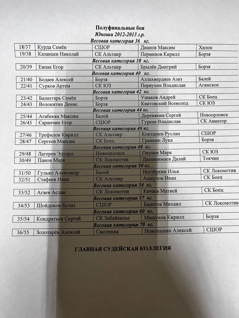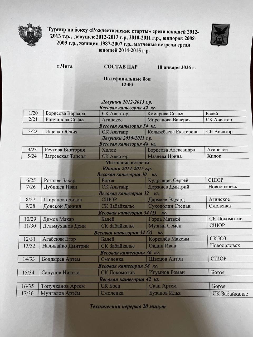Состав пар на полуфинал турнира по боксу «Рождественские старты», среди юношей 2012-2013 г.р., девушек всех возрастов и матчевые встречи среди юношей 2014-2015 г.р.