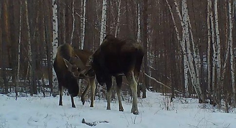 Два лося пытались помериться силой и рогами, но поединок носил больше не враждебный, а дружественный, «тренировочный» характер.