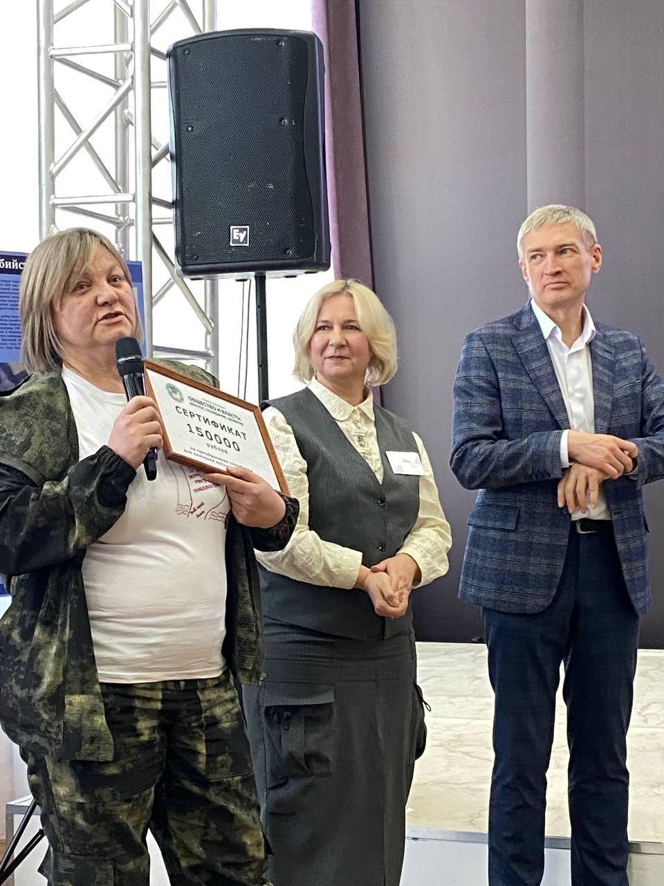 В завершении секции «Волонтёры в эпоху кризисов» Забайкальскому волонтерскому корпусу выдали сертификат на 150 тысяч рублей для покупки спанбонда для плетения маскировочных сетей.