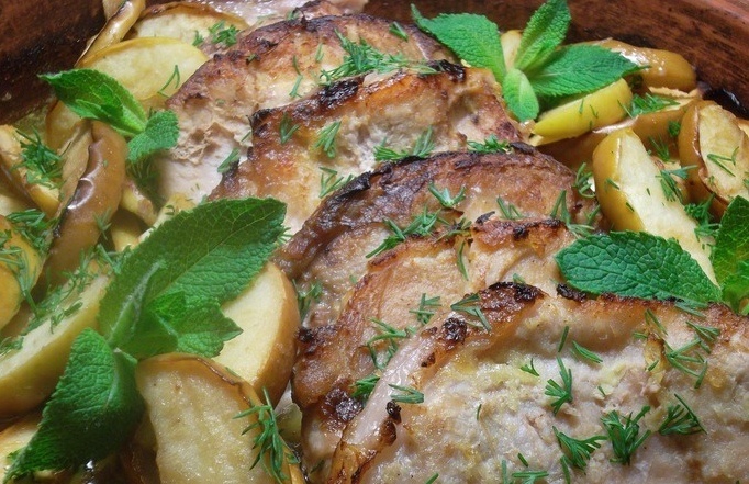 Свинину следует порезать на кусочки толщиной 1,5-2 см, при этом стоит слегка отбить их, используя не кухонный молоточек, а тупую сторону поварского ножа, чтобы не потерять сочность. Далее, яблоки очищаются от сердцевины и нарезаются тонкими дольками.