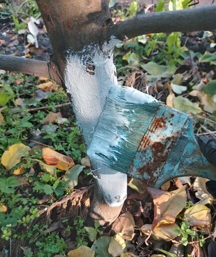 - Перед нанесением краски необходимо тщательно очистить штамб от омертвевшей коры, под которой могут прятаться вредители и болезни. Побелка помогает предотвратить повреждения от грызунов, так как они избегают беленых стволов.
