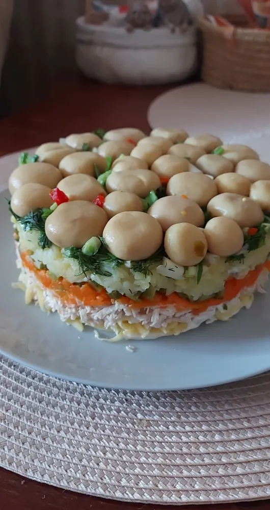 Этот салат укладывается в виде слоев, создавая настоящую грибную симфонию на новогоднем столе. Основа - консервированные грибы, зелёный лук и укроп, создающие яркие акценты. Далее следует слой натёртых варёных яиц, картофеля, а затем - маринованный лук для кислинки и невероятного вкуса, сообщает Дзен-канал "Кулинарные записки обо всём".