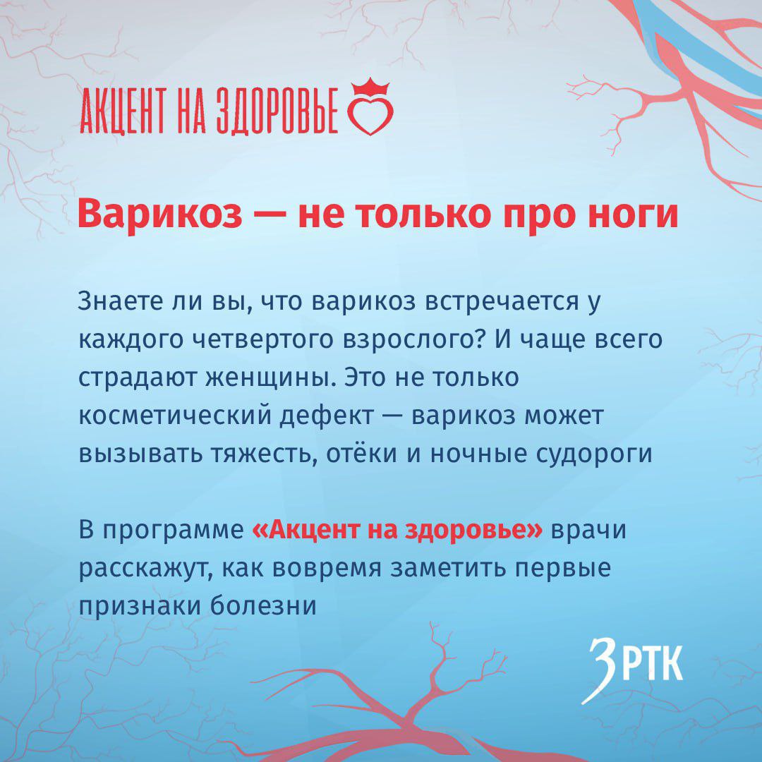 Ну, хотя бы с нашего выпуска программы «Акцент на здоровье» с врачами-флебологами. Специалисты рассказали как вернуть ногам лёгкость и красоту, остановив развитие варикоза.