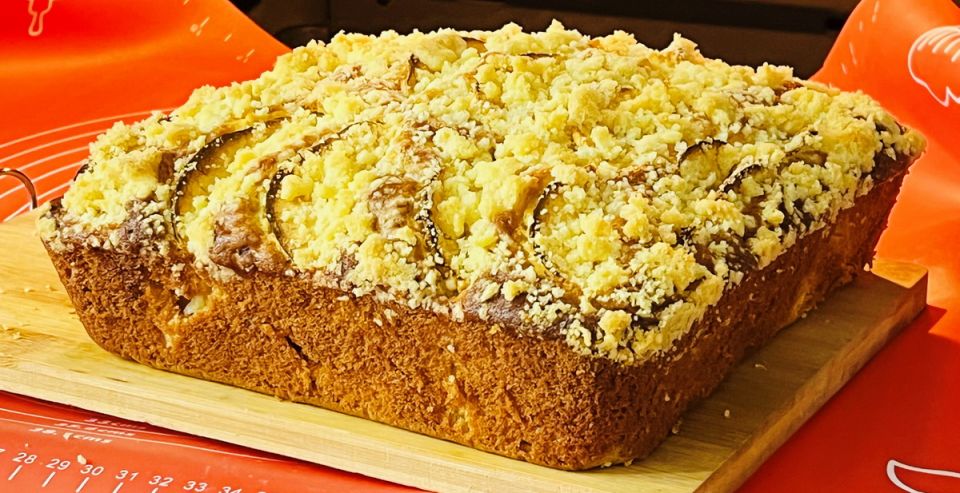 После того как тесто готово, его выливают в смазанную маслом форму для выпечки или выкладывают на пергаментную бумагу. Затем равномерно распределите по поверхности теста яблоки, добавьте сладкую крошку, приготовленную из масла, сахара и муки. Установите пирог в предварительно разогретую до 180 градусов Цельсия духовку и выпекайте в течение 35-40 минут.