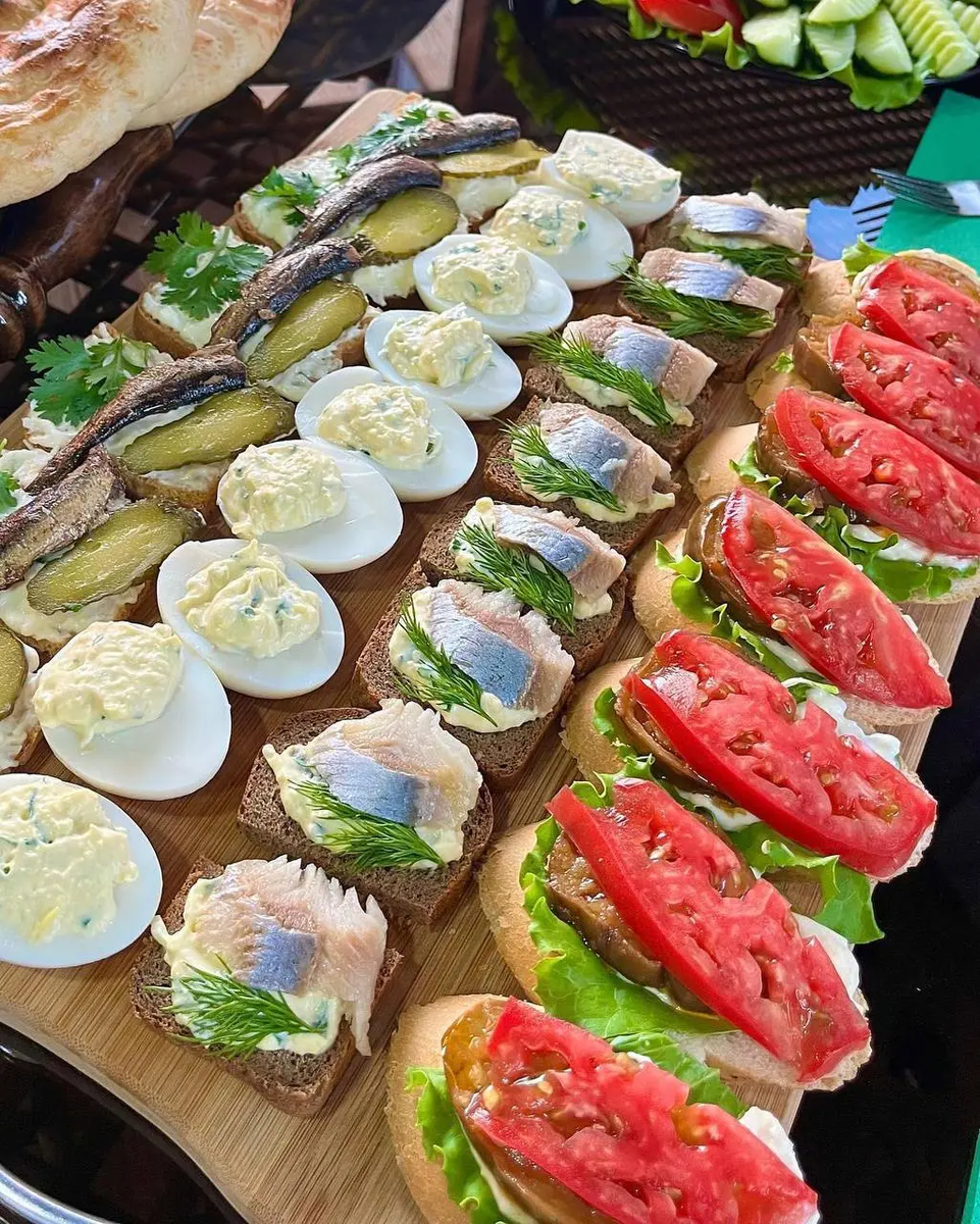 - Бутерброды с селедкой: Необходим ржаной хлеб, на который наносят намазку из вареного яйца с майонезом. Добавляется укроп и зеленый лук, а верх завершает малосольная сельдь — сочетание, которое невозможно не полюбить!