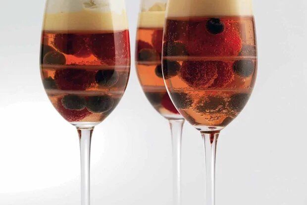 На дно бокалов укладывают по 3-4 ягоды, заливают их получившейся смесью, чтобы она покрывала ягоды. Дают времени пени остыть, и ставят бокалы в холодильник на 15 минут. Когда первый желейный слой застынет, следует повторить процесс добавления ягод и наливания шампанского, чтобы обеспечить равномерное распределение ягод по всему десерту.