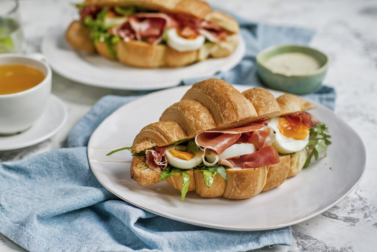 Шаг 3: Разрезать круассаны вдоль, не доходя до конца, чтобы получился кармашек. При желании немного подогреть их на сухой сковороде в течение 10-15 секунд. Внутри щедро смазать соусом, затем положить прошутто, яичные половинки и свежую рукколу. Подавайте сразу же, наслаждаясь бесконечным сочетанием вкусов.