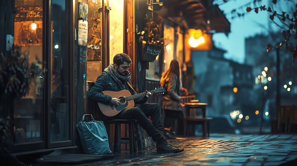Медленно собравшись с мыслями, она направилась по пустынной улице. Вдруг её внимание привлекли звуки гитары из закрытого кафе. Она подошла ближе и узнала парня с гитарой — Никиту, своего школьного друга, который всегда мечтал стать музыкантом.
