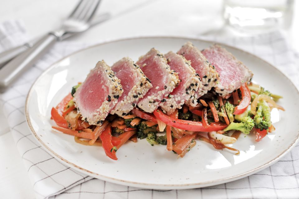 Овощи станут превосходной подушкой для тунца, и данный кулинарный шедевр можно подавать сразу же. Этот яркий и необычный выбор обязательно вызовет восторг за столом!