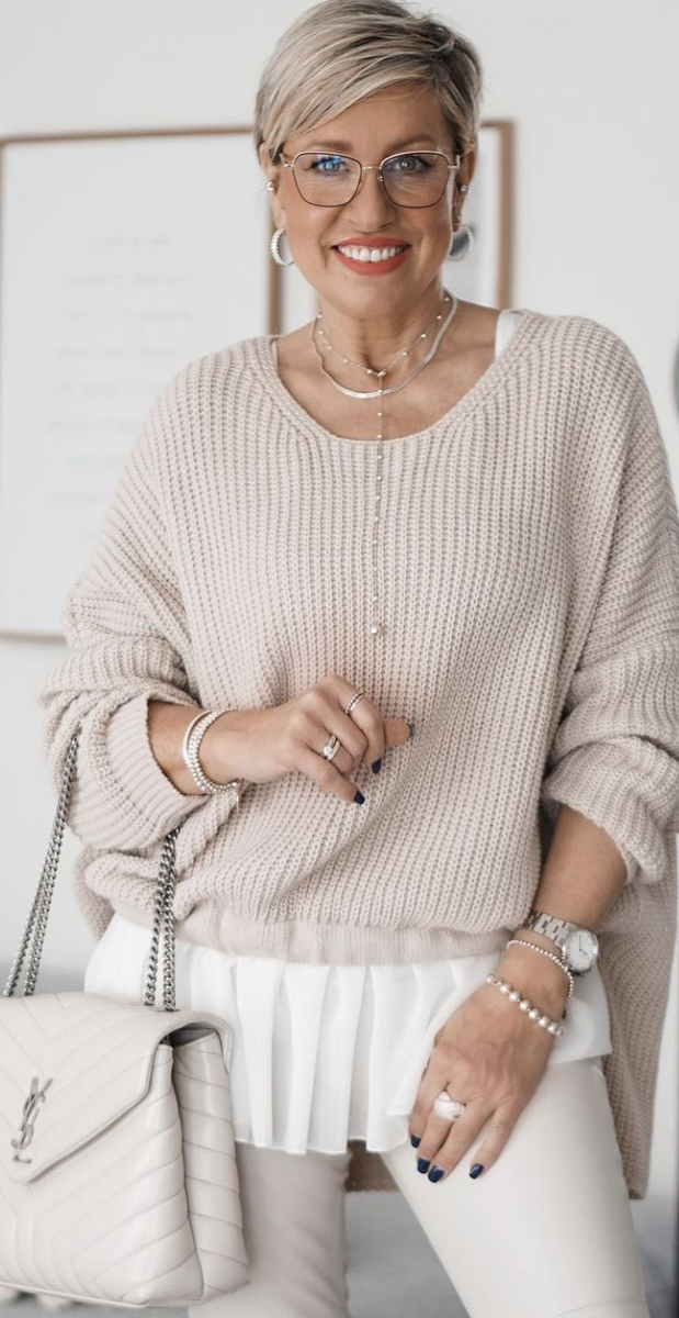 - Свитера: Нейтральные цвета, такие как серый, кремовый или темно-синий, придают образу изысканный вид. Однако, для смелых модниц подойдут яркие и насыщенные оттенки. Модели со сложной текстурой или оригинальной вязкой способны привнести уникальность в образ.