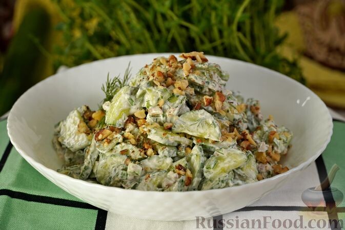 - Салат с огурцами и орехами. Летний и свежий, этот салат порадует сочетанием хрустящих огурцов и орехов, заправленный нежной сметаной с чесноком.