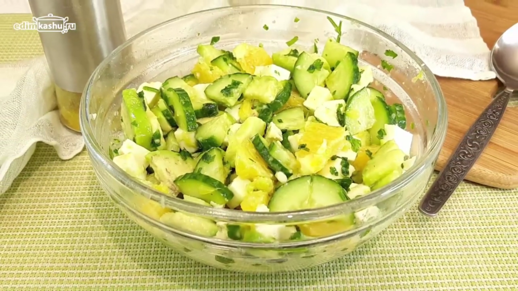 Начать стоит с нарезки огурца и филирования апельсина – мякоть лучше разделить на кусочки. Для салата идеально подойдёт адыгейский сыр, который можно нарезать кубиками или поломать руками. Все приготовленные ингредиенты аккуратно соединяются в салатнице.