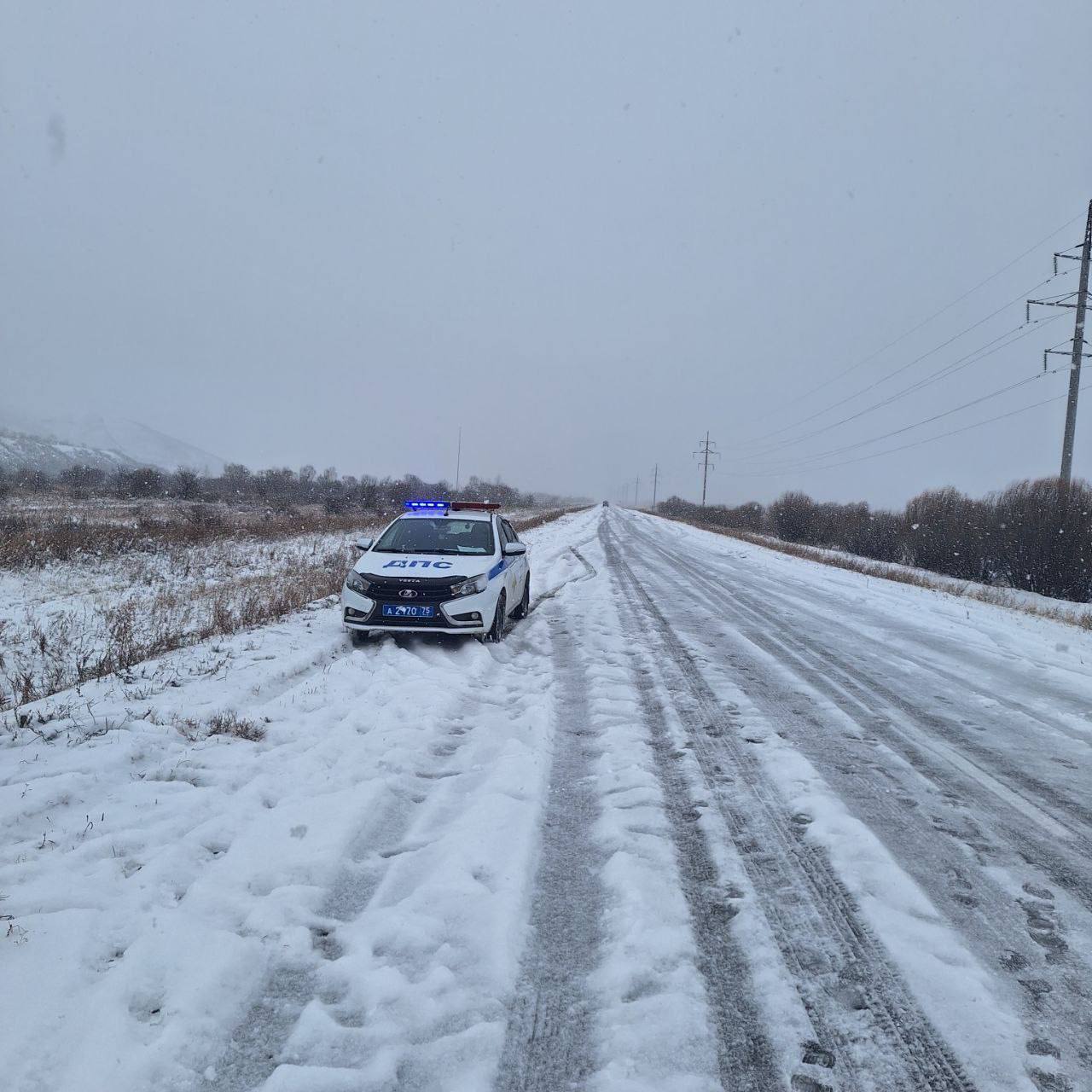 Патрули ДПС дежурят на дорогах Забайкалья из-за выпадения мокрого снега