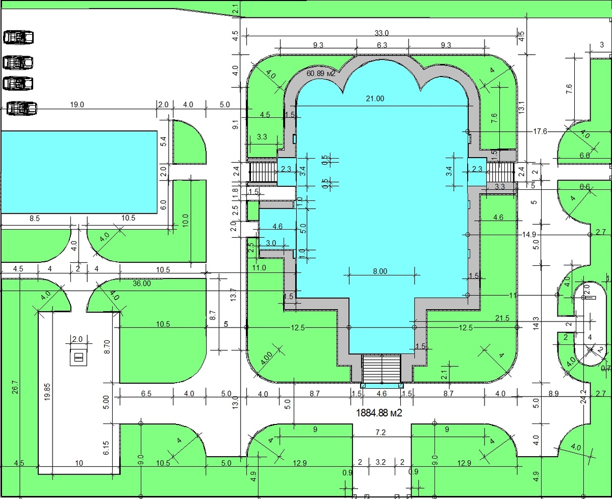 - Область у крыльца храма: прямоугольные участки, подходящие для размещения выделяющихся растений;