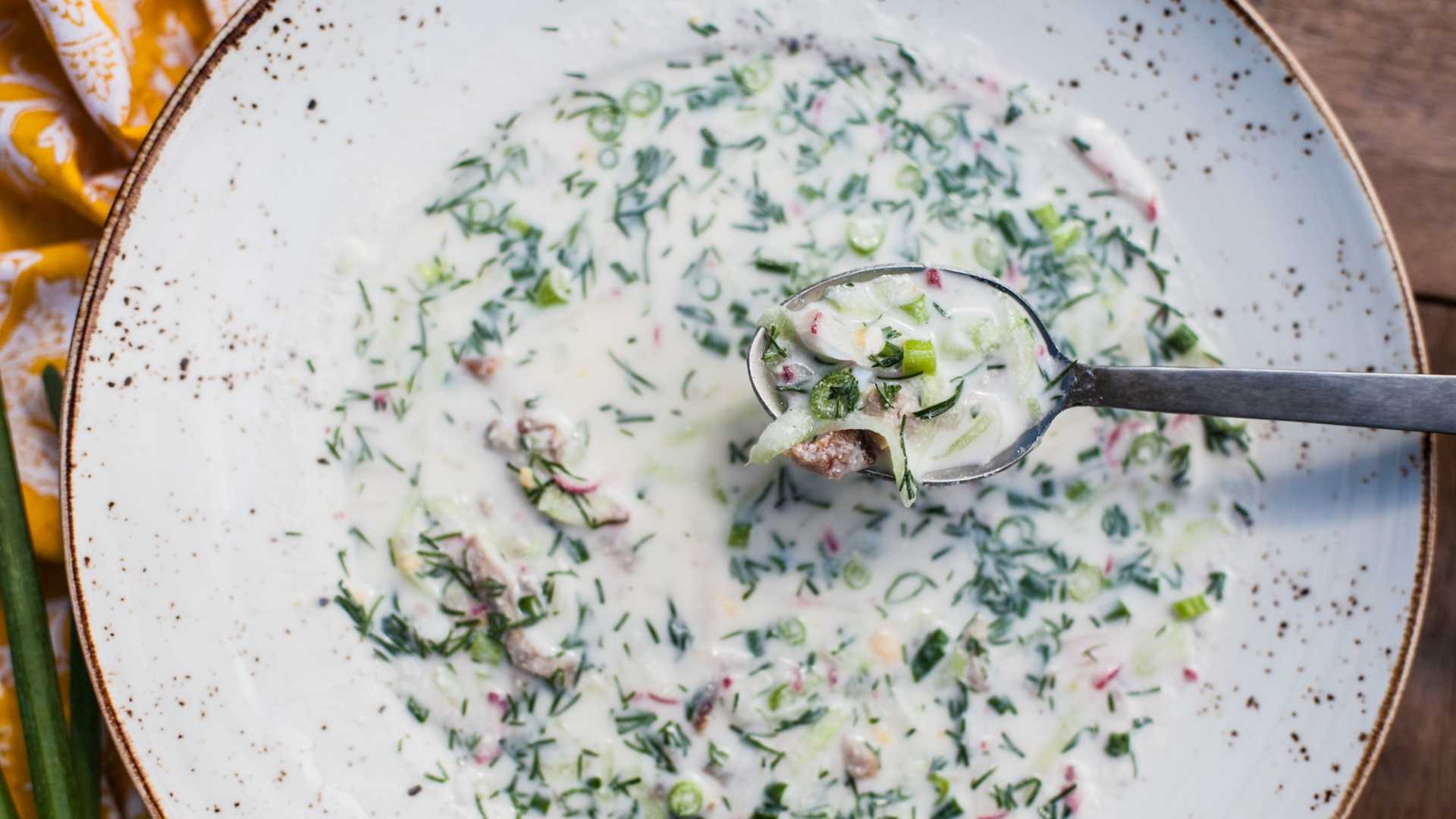Отвариваете мясо щуки, а из трухи, костей и головы — бульон. На бульоне не всплывает жир. Когда вы его остужаете, мешаете 50 на 50 с квасом тем или иным, темным или светлым кислым, и потом уже добавляете все остальные ингредиенты, а также кусочки отварной щуки.