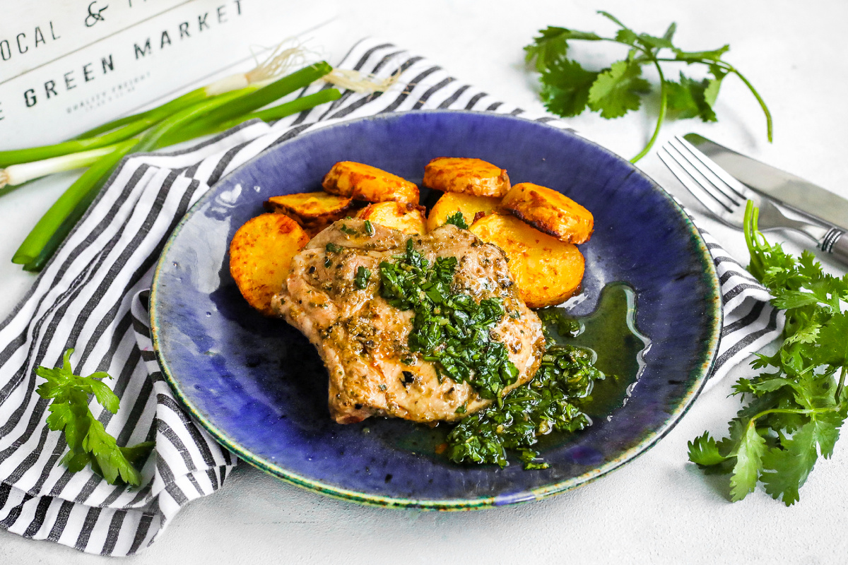 Шаг 4: Готовое мясо выложить в центр тарелки, а рядом разместить картофель. Полить все соусом Чимичурри и подавать сразу же, пока блюдо горячее и ароматное.