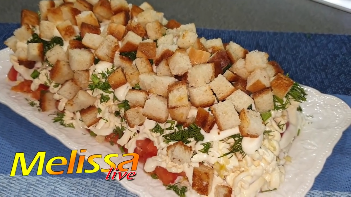 Салат можно украсить сверху тонким слоем майонеза. На последнем этапе добавляются остывшие хрустящие гренки — они придают текстурное разнообразие. Если планируется, что салат постоит некоторое время, стоит отложить гренки до подачи, чтобы они не размокли.