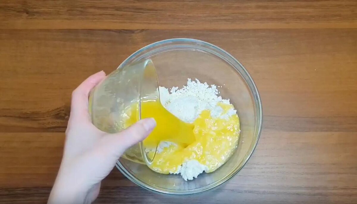 Шаг 2: В эту творожную смесь добавить муку и разрыхлитель. Замесить тесто, которое не будет липнуть к рукам и получится упругим.