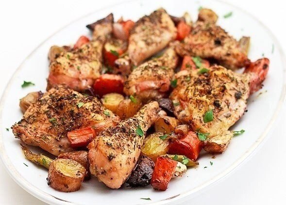 6. По завершении запекания выньте курицу, перемешайте овощи и оставьте их в духовке ещё на 5-10 минут, чтобы они стали мягче и впитали ароматы.