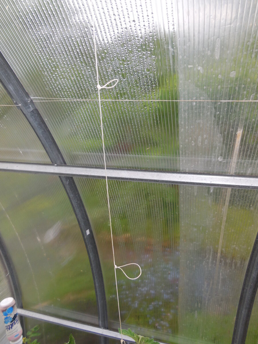 - Сначала леска с узлами нарезается в соответствии с высотой теплицы и фиксируется в верхней части конструкции.