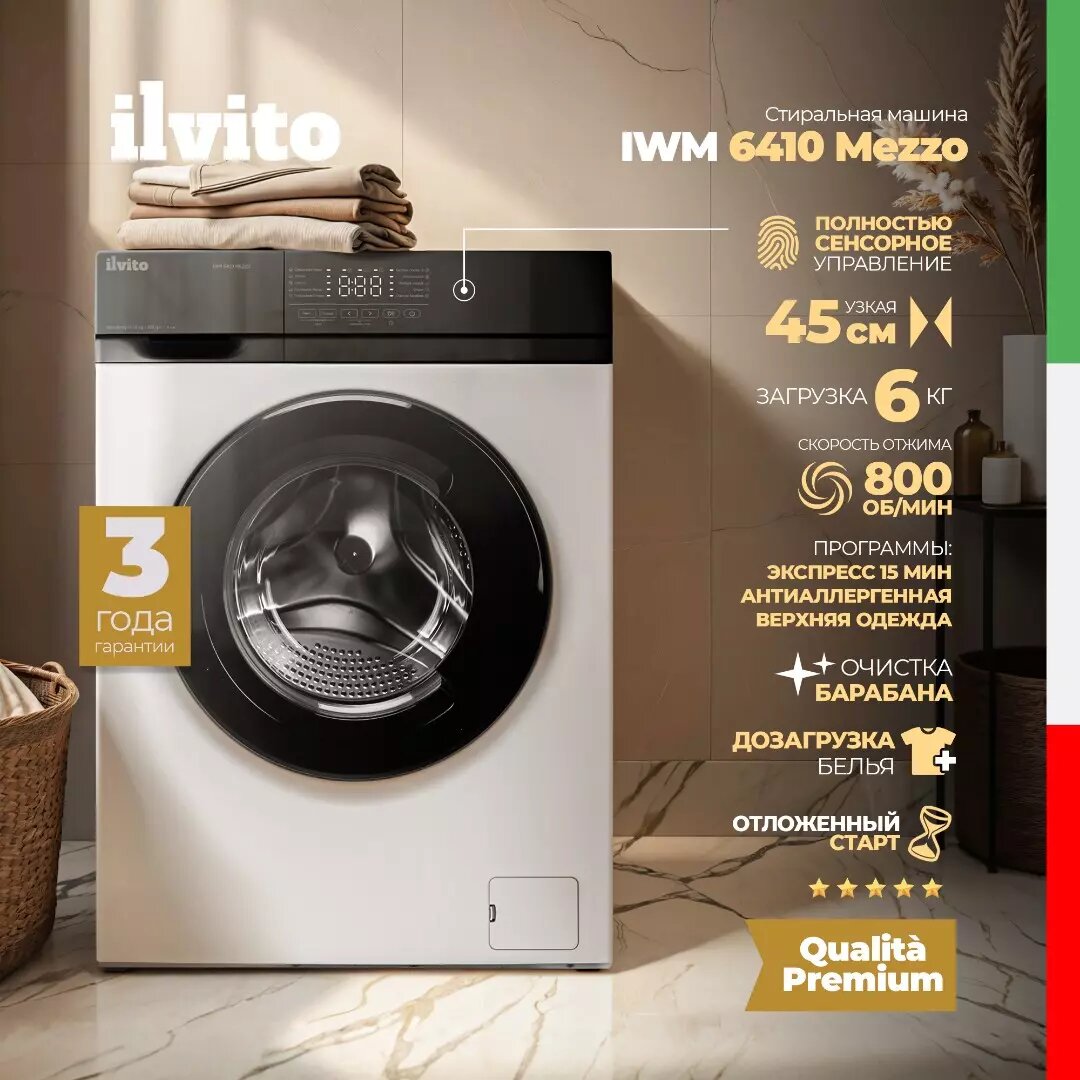 - Для 1-2 человек подойдут устройства с загрузкой 5-6 кг. Такие машины отлично справляются с повседневными стирками, как, например, DeLonghi IWM 6410 MEZZO, компактная и практичная модель.