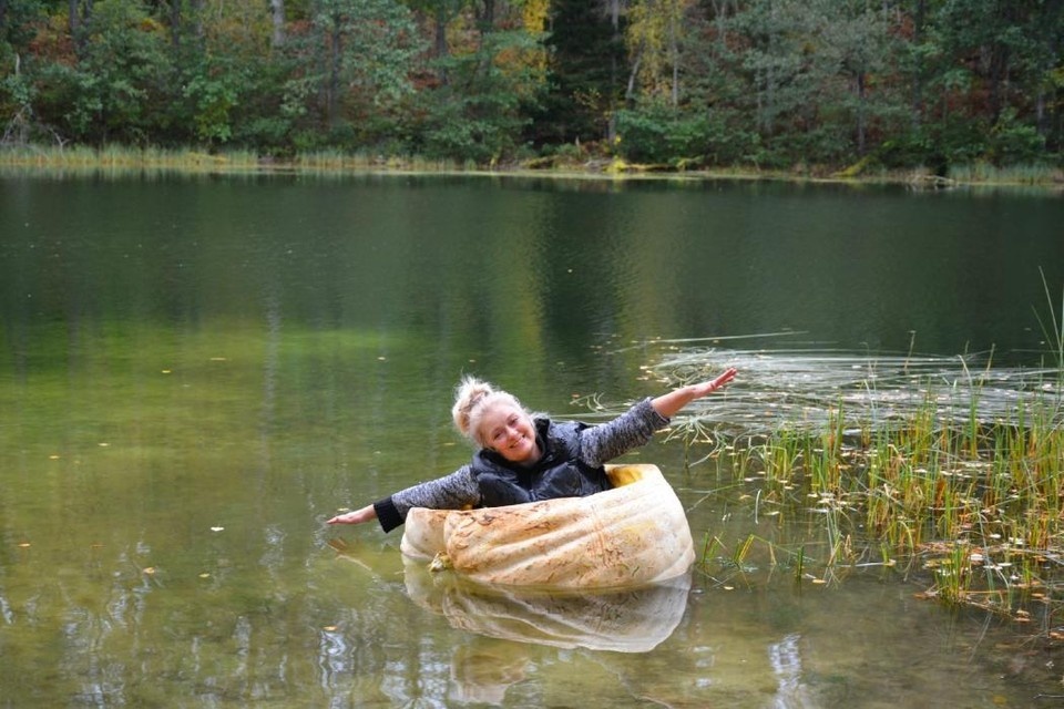 В Санкт-Петербурге подруга осени, Юлия Богданова, поделилась впечатляющей историей о своем новом приключении. Она вырастила на своем дачном участке в деревне Игомель, расположенной в Плюсском районе, колоссальную тыкву весом в 221 килограмм и на этот раз превратила ее в оригинальную лодку.