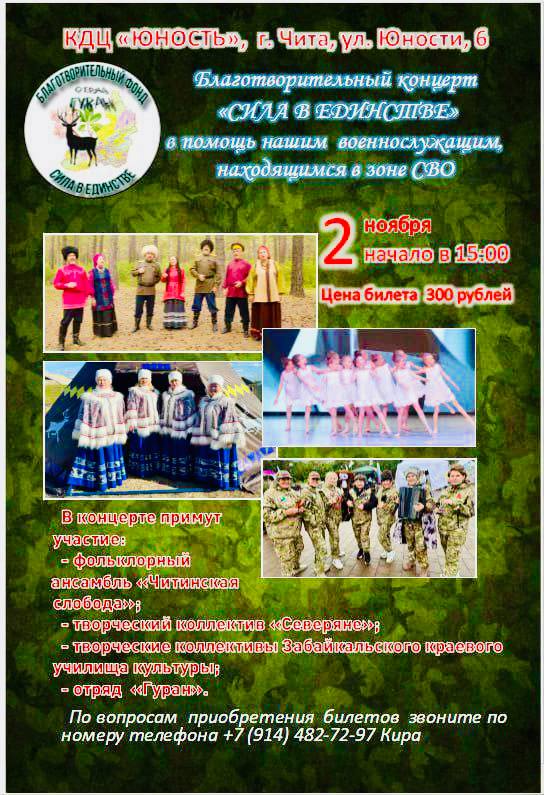 С таким призывом обращаются к землякам сотрудники КДЦ «Юность» (город Чита, ул. Юности, 6), где 2-го ноября в 15.00 начнется благотворительный концерт «Сила – в единстве!»