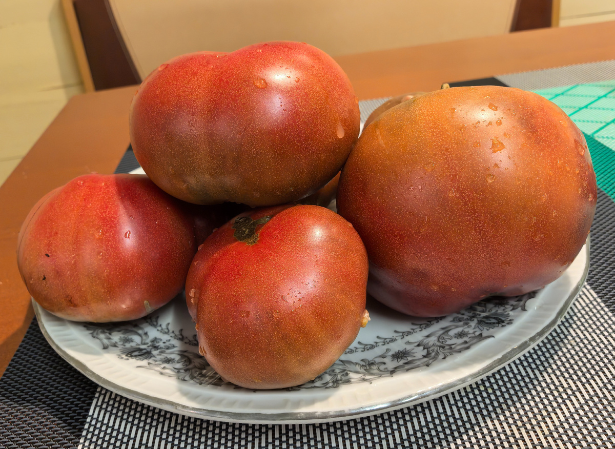 Плоды этого сорта представляют собой плоскоокруглые томаты, которые на пике зрелости приобретают насыщенный красно-бордовый цвет. Мякоть темно-вишневая и невероятно ароматная, а его вкус просто божественен. Средний вес помидоров варьируется от 350 до 450 граммов, что делает их не только вкусными, но и больших размеров.