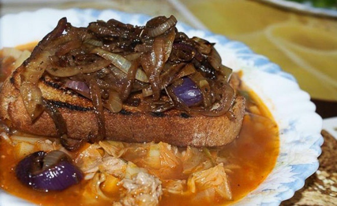 Сначала следует сварить насыщенный мясной бульон. После этого лук нарезается кольцами, из которых 1-2 луковицы откладываются в сторону для дальнейшего использования. К оставшемуся луку добавляются соль, перец и тимьян, а затем обжариваются до мягкости. Немного бальзамического уксуса придаст ему особый вкус и аромат.