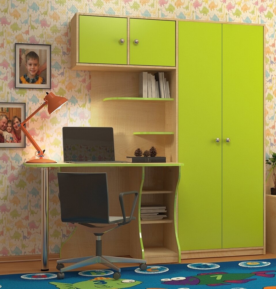 Если в вашем доме не хватает места, можно выделить детский уголок с помощью шкафа или стеллажа. Даже в ограниченном пространстве стоит стремиться к наличию письменного стола — если места очень мало, подойдет стол с откидной доской.