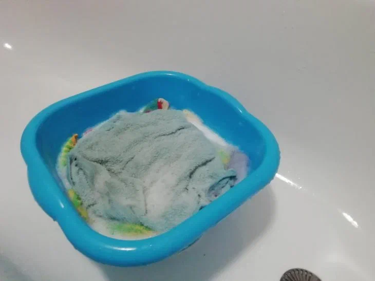 В таз для стирки стоит добавить воду, чуть теплую, а затем немного средства.