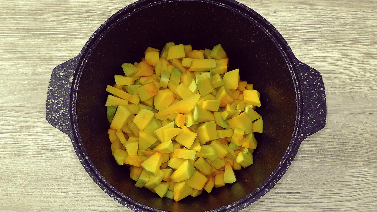 Сначала тыкву следует тщательно очистить от кожуры и удалить семена. После этого нарезать ее на кусочки. Если планируется перемолоть смузи блендером, размер кусочков не важен. Затем необходимо выжать сок из апельсинов, процедить его и добавить к нарезанной тыкве.