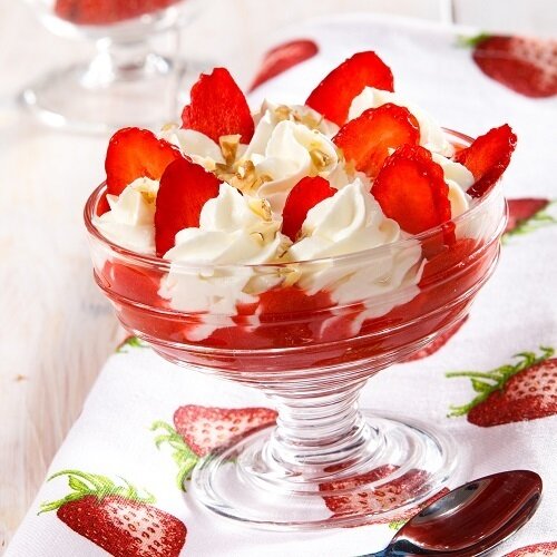 Классика жанра — клубника, политая свежими сливками. Но что, если добавить к этому взбитый творог и хрустящие грецкие орехи? Это весёлое сочетание сделает привычный десерт совершенно новым! Такой вариант порадует покупателей на даче и станет замечательным завершением ужина.