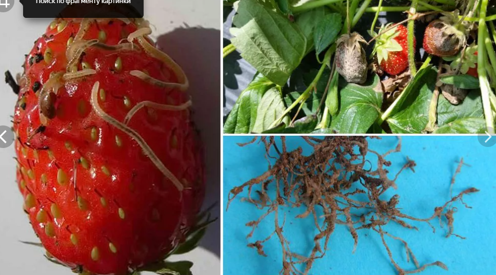 Клубника — один из самых любимых ягодных кустарников, но, к сожалению, она часто становится жертвой коварных вредителей. Нематода — микроскопический червь, незаметный для глаза, может натворить много бед. Первые признаки поражения — скрученные молодые листья и укороченные цветоносы. Позднее на стеблях появляются узелковые разрастания, напоминающие цветную капусту, а в спелых ягодах можно обнаружить червей. Всё это говорит о том, что кустик уже сильно поражен нематодой.