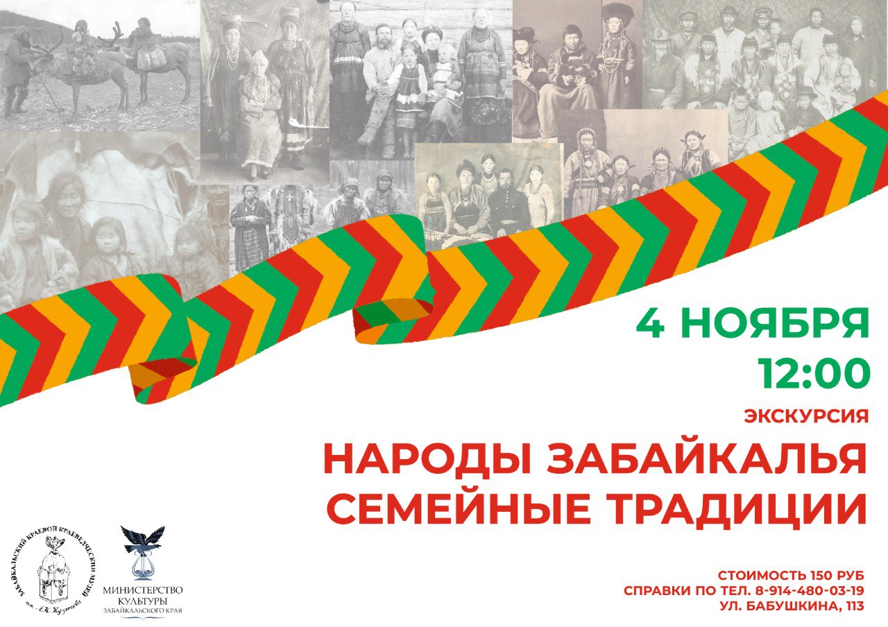 Приглашаем вас на тематическую экскурсию “Народы Забайкалья. Семейные традиции”, которая пройдет 4 ноября в 12:00 в Забайкальском краеведческом музее. Стоимость экскурсии 150 руб.