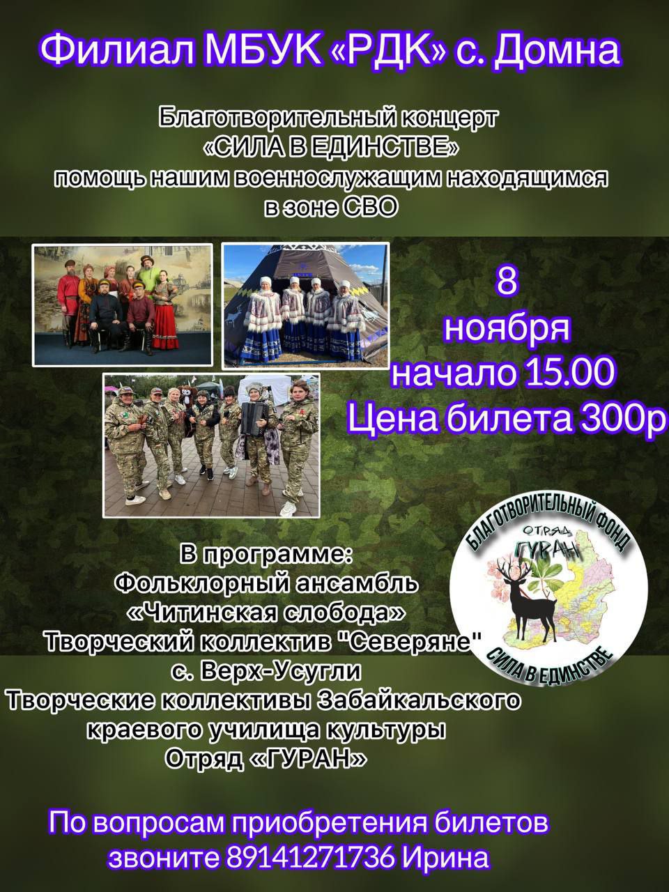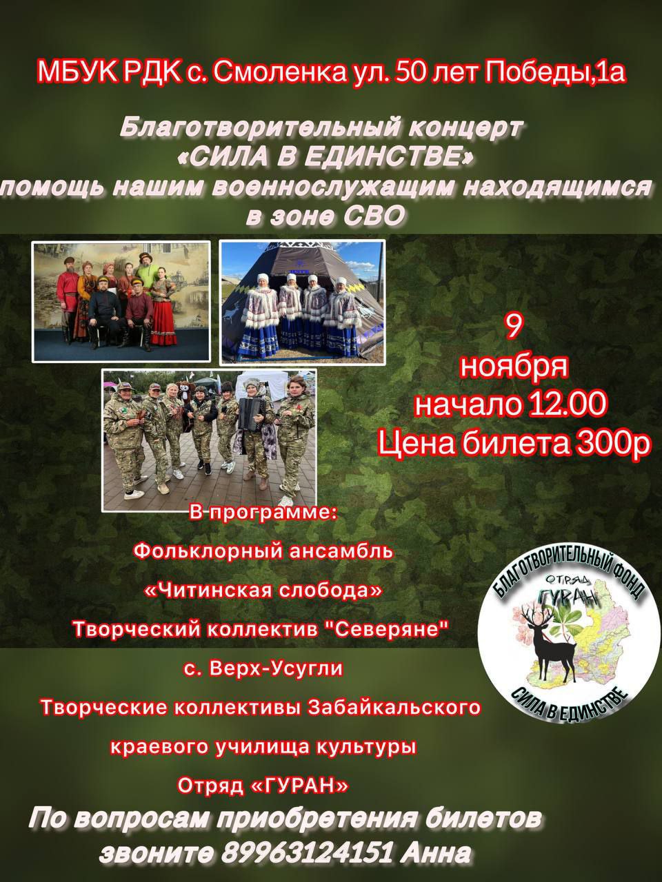 Еще два концерта запланированы 8 ноября в 15.00 в Доме культуры села Домна и 9 ноября - в селе Смоленка (улица 50 лет Победы 1а) в 12.00. Зрители увидят выступления фольклорного ансамбля «Читинская слобода», творческого коллектива «Северяне», коллективов Забайкальского краевого училища культуры и отряда Гуран.