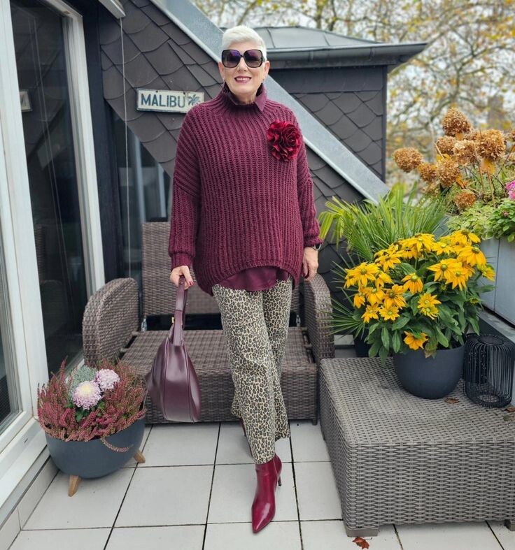 - Легендарный леопард: Свободные брюки с леопардовым принтом подойдут для любой фигуры. Их можно сочетать с бордовой рубашкой оверсайз или объемным свитером такого же цвета. Яркие полусапожки и сумка сливового оттенка добавят образу нотки элегантности.