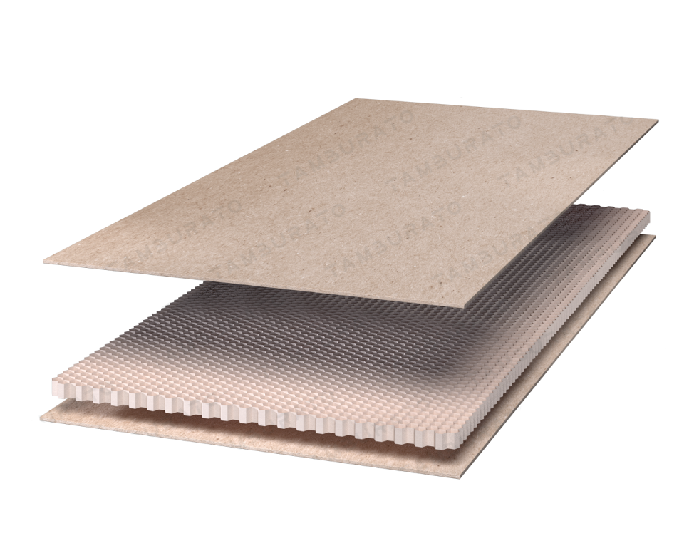 Тамбурат представляет собой легкий и прочный композитный плитный продукт, состоящий из внешних слоев, выполненных из древесных панелей (МДФ, ЛДСП или ХДФ), и внутреннего наполнителя из картона, который имеет сотовую структуру. Этот уникальный подход обеспечивает отличные эксплуатационные характеристики, что делает его идеальной альтернативой массивному дереву, которое часто бывает тяжелым и трудным в обработке.