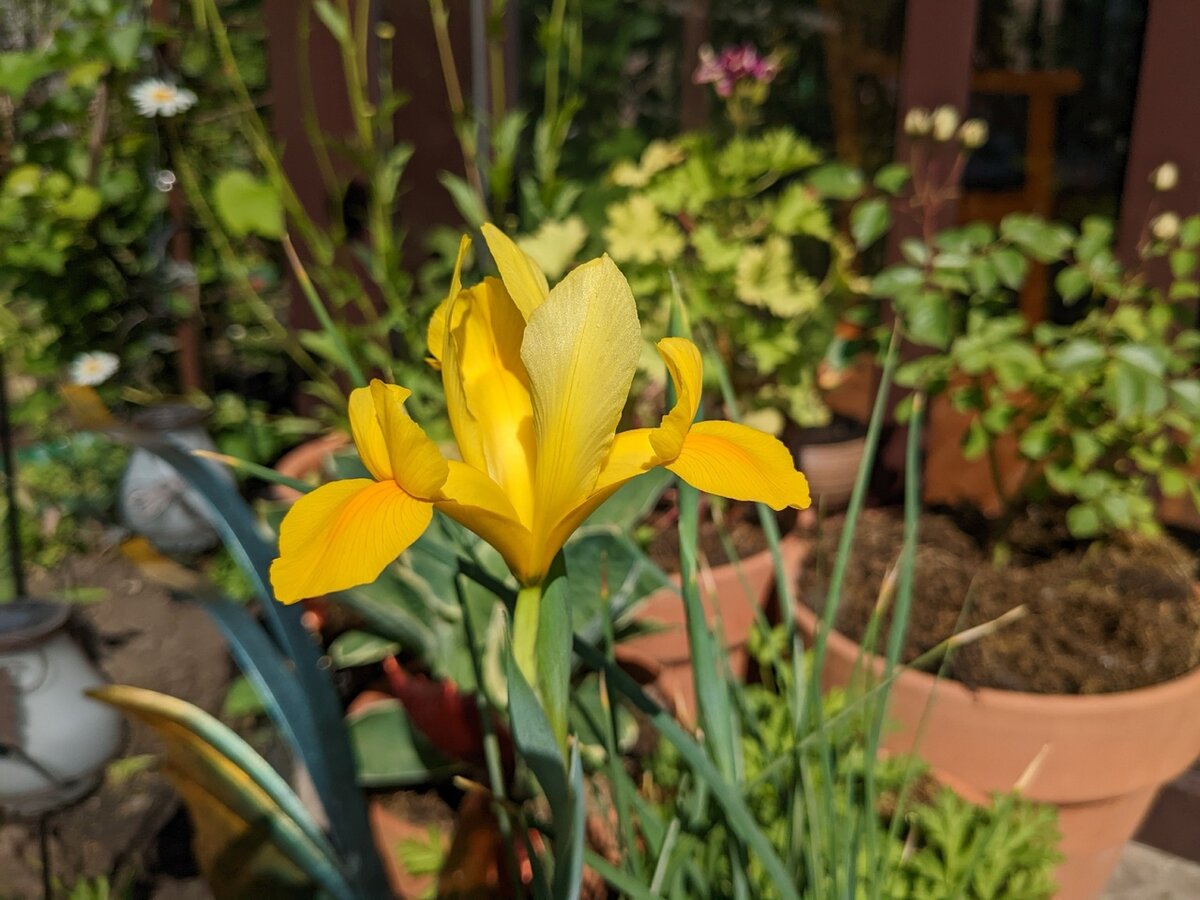 Прямо у бочки, где происходил полив, этот ирис не только выжил, но и зацвел в июне. Вот только выяснившийся ксифиум (голландский ирис) стал источником новых забот. Его уход требует других условий, нежели у бородатых ирисов, что вызывает множество вопросов о его будущем в саду.