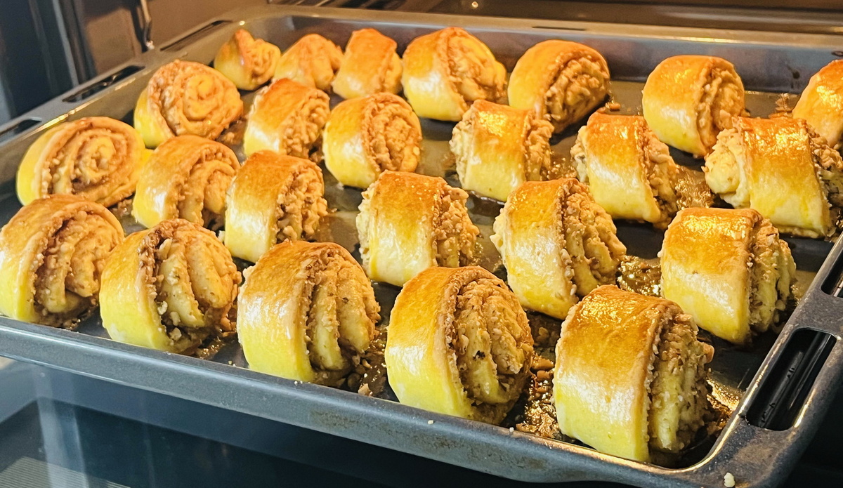 Поместите рулеты на противень, смазанный маслом. По желанию можно смазать их желтком для придания золотистой корочки. Выпекайте в разогретой до 180 градусов духовке около 20 минут до золотистого цвета. Наслаждайтесь ароматной и вкусной выпечкой с чаем!