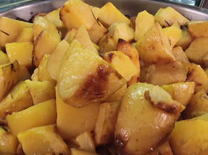 Картофель нарежьте кубиками, сбрызните лимонным соком для аромата и готовьте при 190°C около 20 минут.
