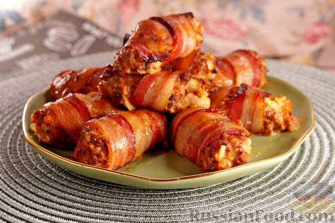 - Куриные котлеты в беконе. Эти аппетитные котлеты, запеченные в духовке, радуют своим сочным мясом и хрустящей корочкой. Бекон добавляет особого аромата, а пряности делают это блюдо более изысканным.
