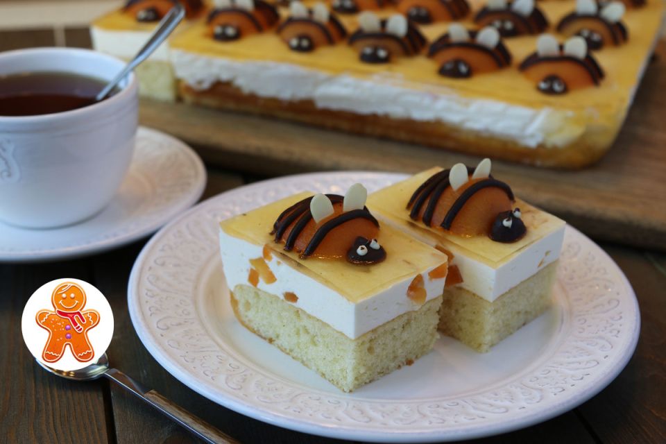 Крем распределяется по охладившемуся коржу, после чего пирог отправляется в холодильник для застывания. Заранее изготовленные шоколадные фигурки пчелок размещаются на вершине, а верхнюю часть пирога покрывают сладким абрикосовым желе. Пирог оставляют в холодильнике до полного застывания, а затем извлекают из формы, аккуратно разделяя на порции с изысканным и аккуратным срезом.