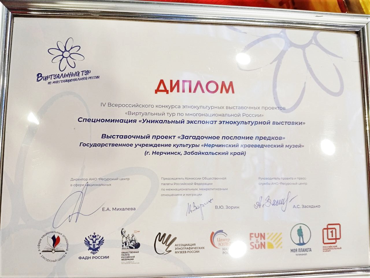 Видеоролик Нерчинского краеведческого музея, созданный сотрудниками Светланой Былковой и Юрием Кузнецовым, победил в специальной номинации «Уникальный экспонат этнокультурной выставки» всероссийского конкурса этнокультурных выставочных проектов «Виртуальный тур по многонациональной России». Об этом 20 ноября сообщили на странице учреждения во «ВКонтакте».